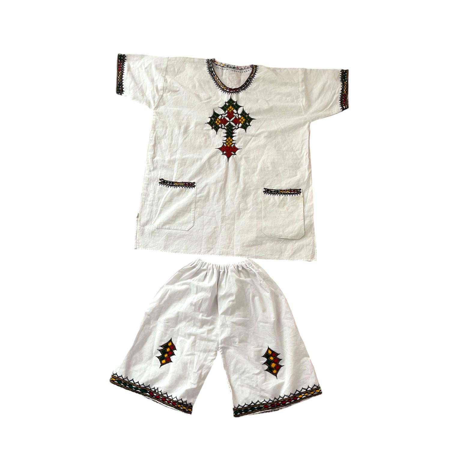 This is a beautifully handcrafted traditional Ethiopian T-shirt and shorts set, designed with care and attention to detail. Made to fit children ages 12 to 15, it combines cultural elegance with comfort, perfect for special occasions or everyday wear.